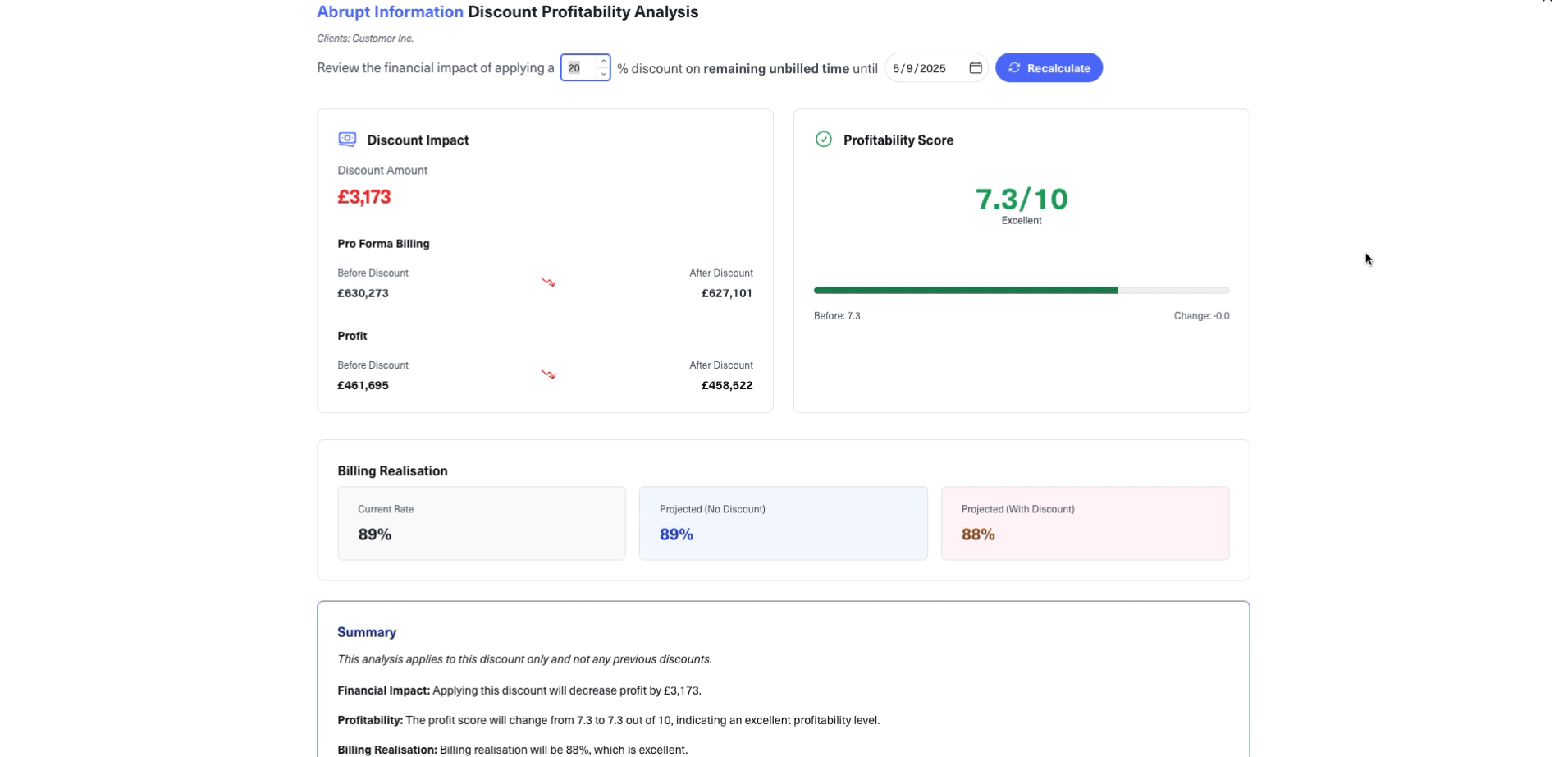 Profitability Analysis: Once the discount percentage is set, the simulator calculates the projected profitability based on the remaining unbilled time associated with the matter. It provides a detailed report showing: