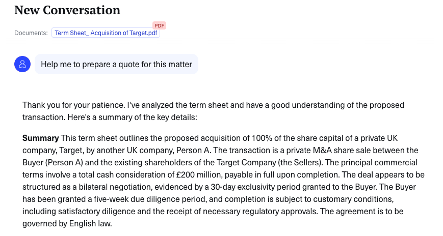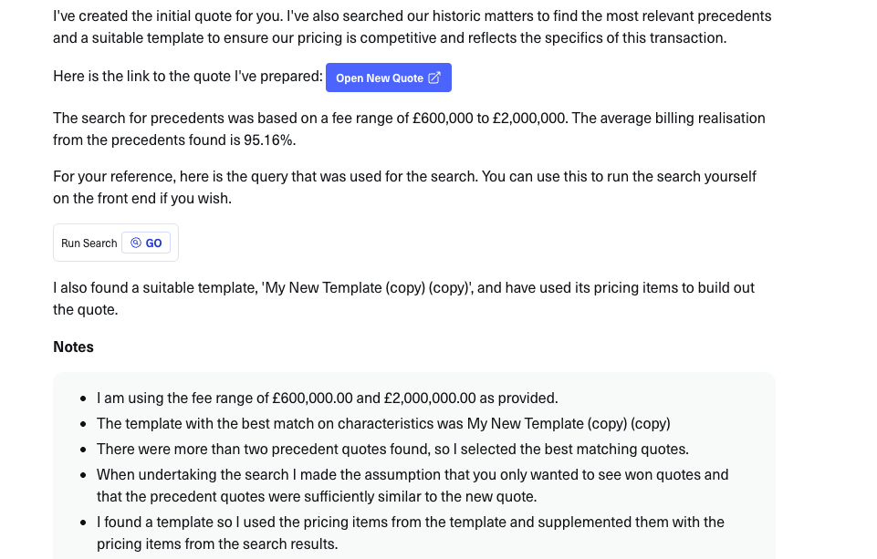 - If you want to steer the quote, tell the Pricing Agent to use specific precedents and provide Matter IDs.