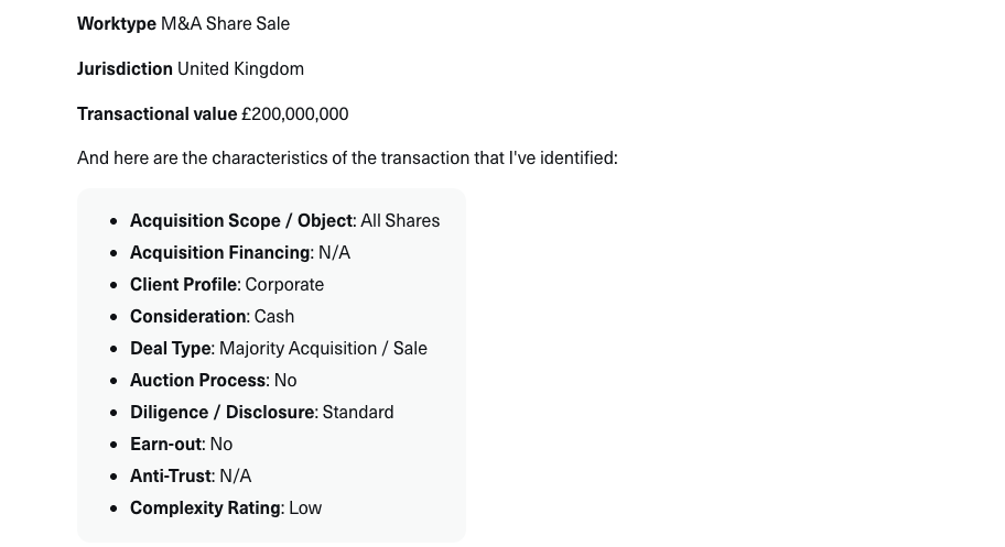 - Matter features are correct (work type, jurisdiction, value where relevant, key features).